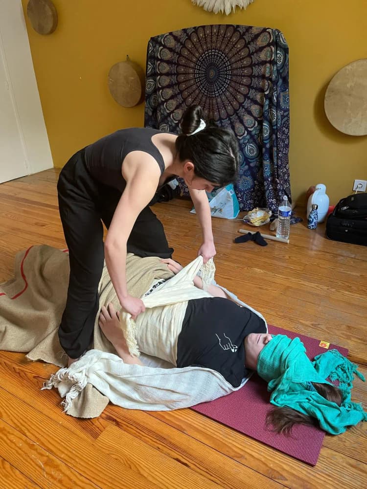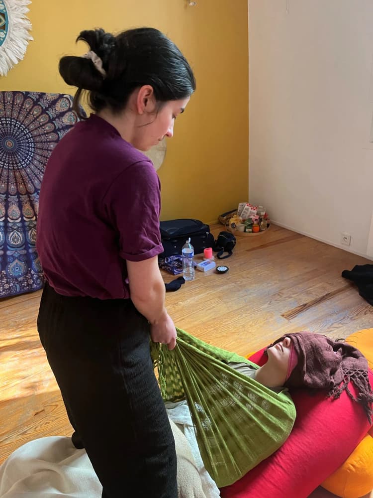 J’ai été formée par Elsa Urzan, doula et formatrice en soin Rebozo.